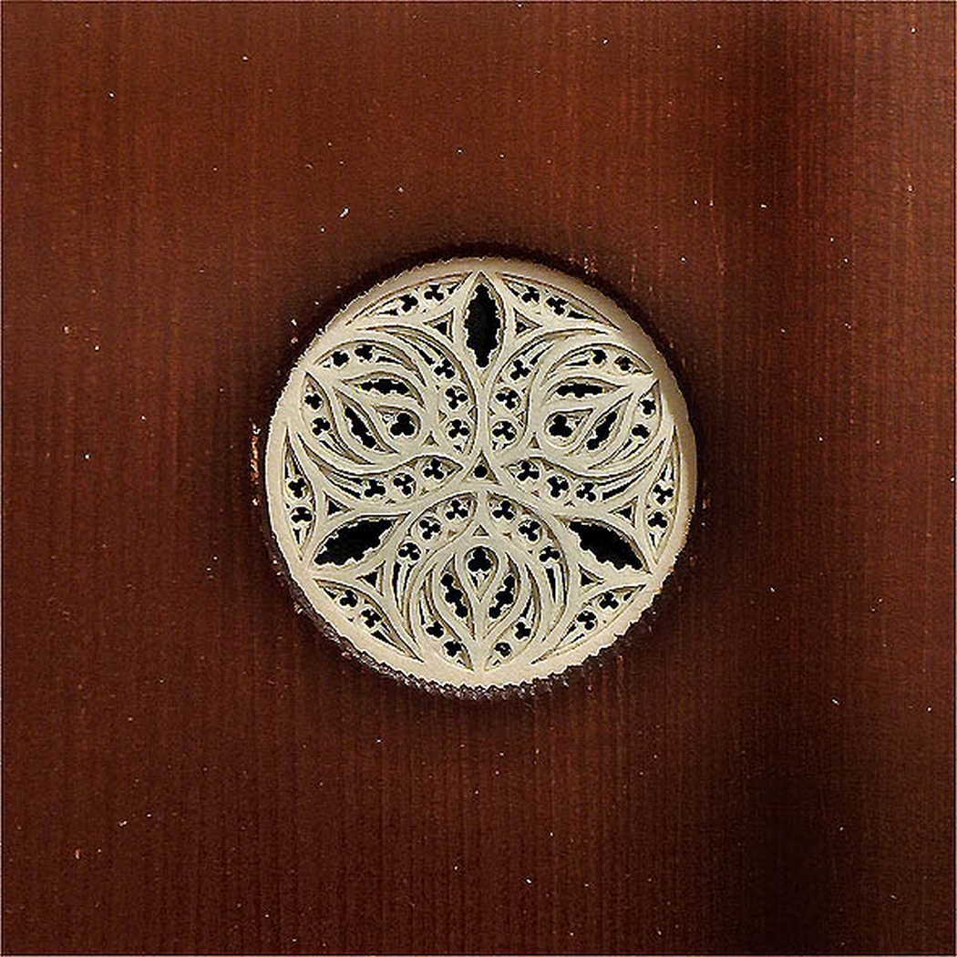 Benutzen Sie ungefülltes Pergament (dieses enthält keine Leim- und Kreideschicht, die es weich und weiß machen soll). Die hier dargestellten Rosetten sind aus naturfarbenem Pergament, das aus alten Manuskripten gewonnen wurde, die eine braune bis graubraune Farbe hatten. Weißes Pergament neigt eher dazu, knallig auszusehen. Wenn aber helle Hölzer wie Ahorn verwendet werden, kann weißes Pergament passend sein.