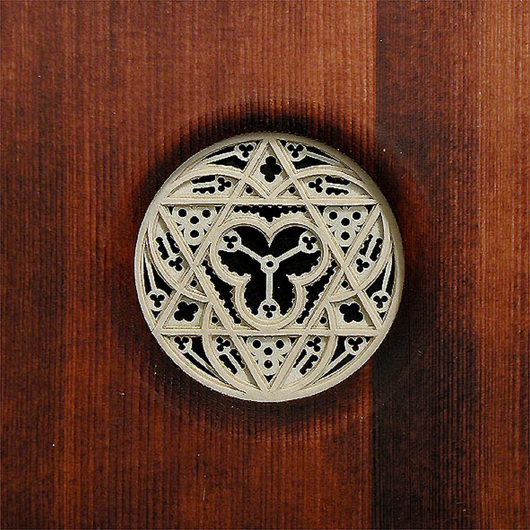 Benutzen Sie ungefülltes Pergament (dieses enthält keine Leim- und Kreideschicht, die es weich und weiß machen soll). Die hier dargestellten Rosetten sind aus naturfarbenem Pergament, das aus alten Manuskripten gewonnen wurde, die eine braune bis graubraune Farbe hatten. Weißes Pergament neigt eher dazu, knallig auszusehen. Wenn aber helle Hölzer wie Ahorn verwendet werden, kann weißes Pergament passend sein.