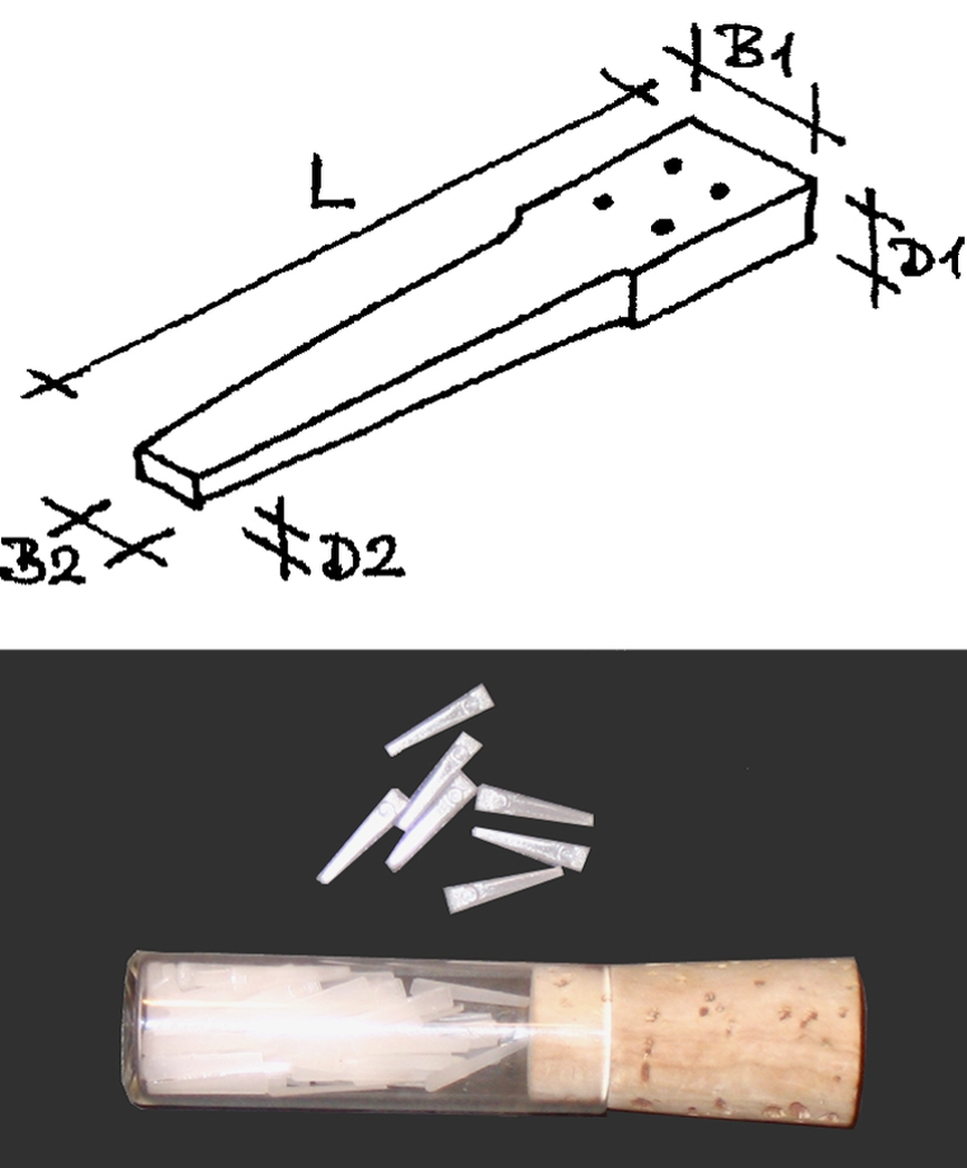 Vorintonierte “Delrin”-Kiele sind in einer trapezförmigen Form gespritzt, um die Intonationsarbeit zu erleichtern. Wir konnten unsere Spritzform dahingehend optimieren, dass unsere Plectren eine den aus extrudierten Platten gestanzten Plectren ebenbürtige Standzeit erreichen.