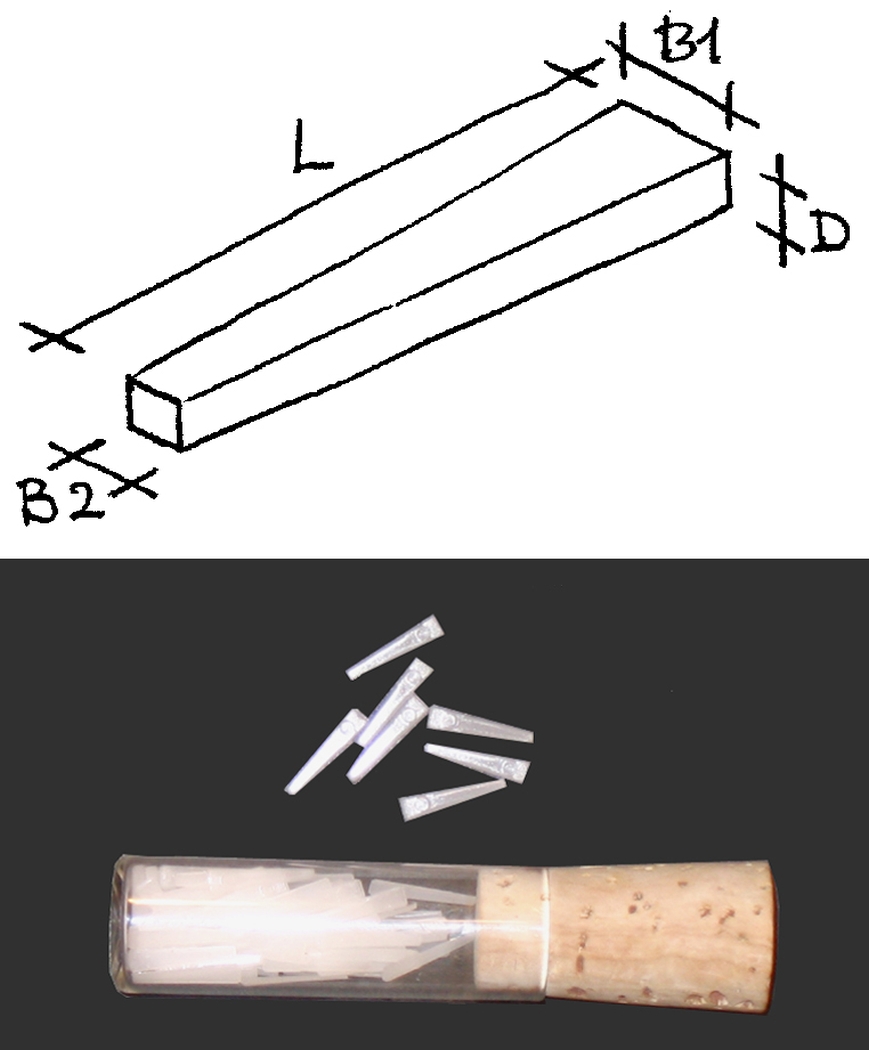 Vorintonierte “Delrin”-Kiele sind in einer trapezförmigen Form gespritzt, um die Intonationsarbeit zu erleichtern. Wir konnten unsere Spritzform dahingehend optimieren, dass unsere Plectren eine den aus extrudierten Platten gestanzten Plectren ebenbürtige Standzeit erreichen.
