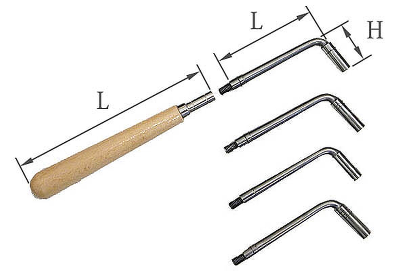 Klavierstimmschlüssel, bestehend aus Holzgriff und auswechselbaren Einsätzen in L-Form für normale Wirbelstärken.