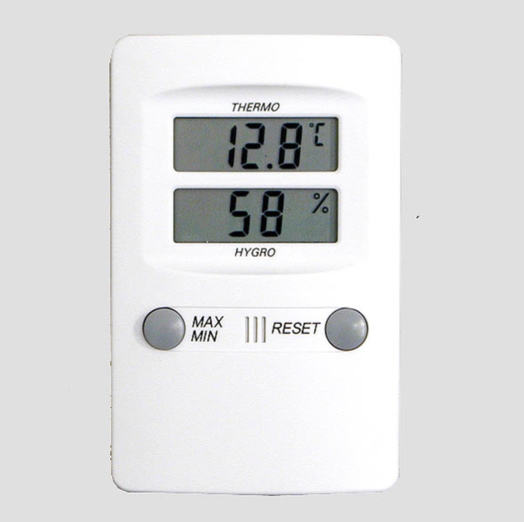 Preisgünstigesdigitales Hygro-Thermometer, zur Messung der relativen Luftfeuchtigkeit und der Temperatur. Mit Speicher für Höchst- und Tiefstwerte von Temperatur und Feuchte.