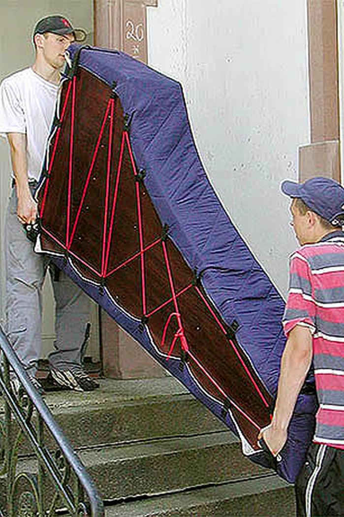Dazu liefern wir ein passendes Seil mit. Zusätzlich werden sechs Tragegurte fest angenäht, so dass das Instrument horizontal oder vertikal von zwei oder mehreren Personen getragen werden kann.