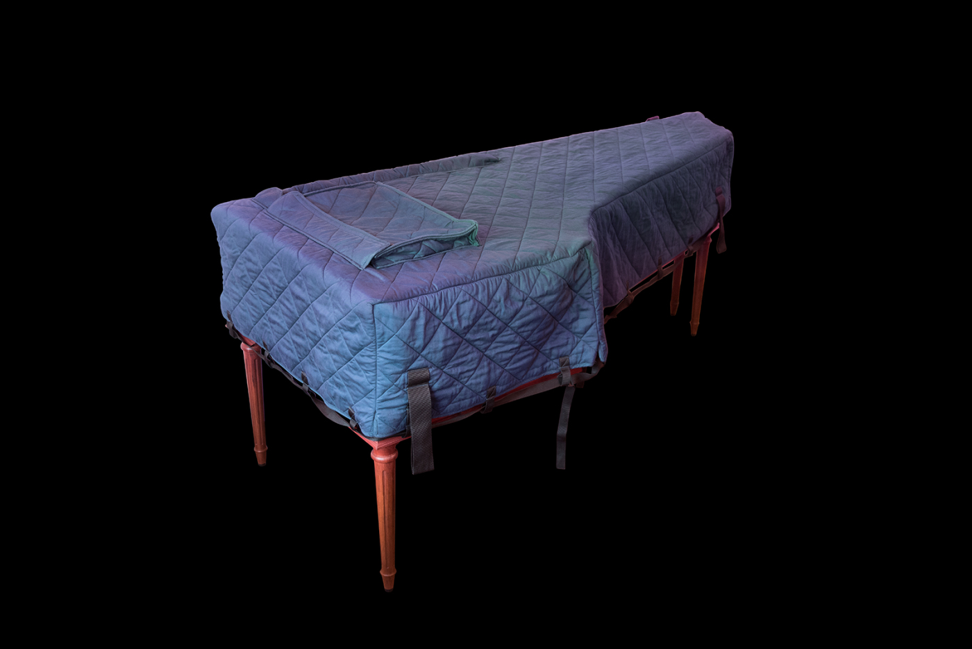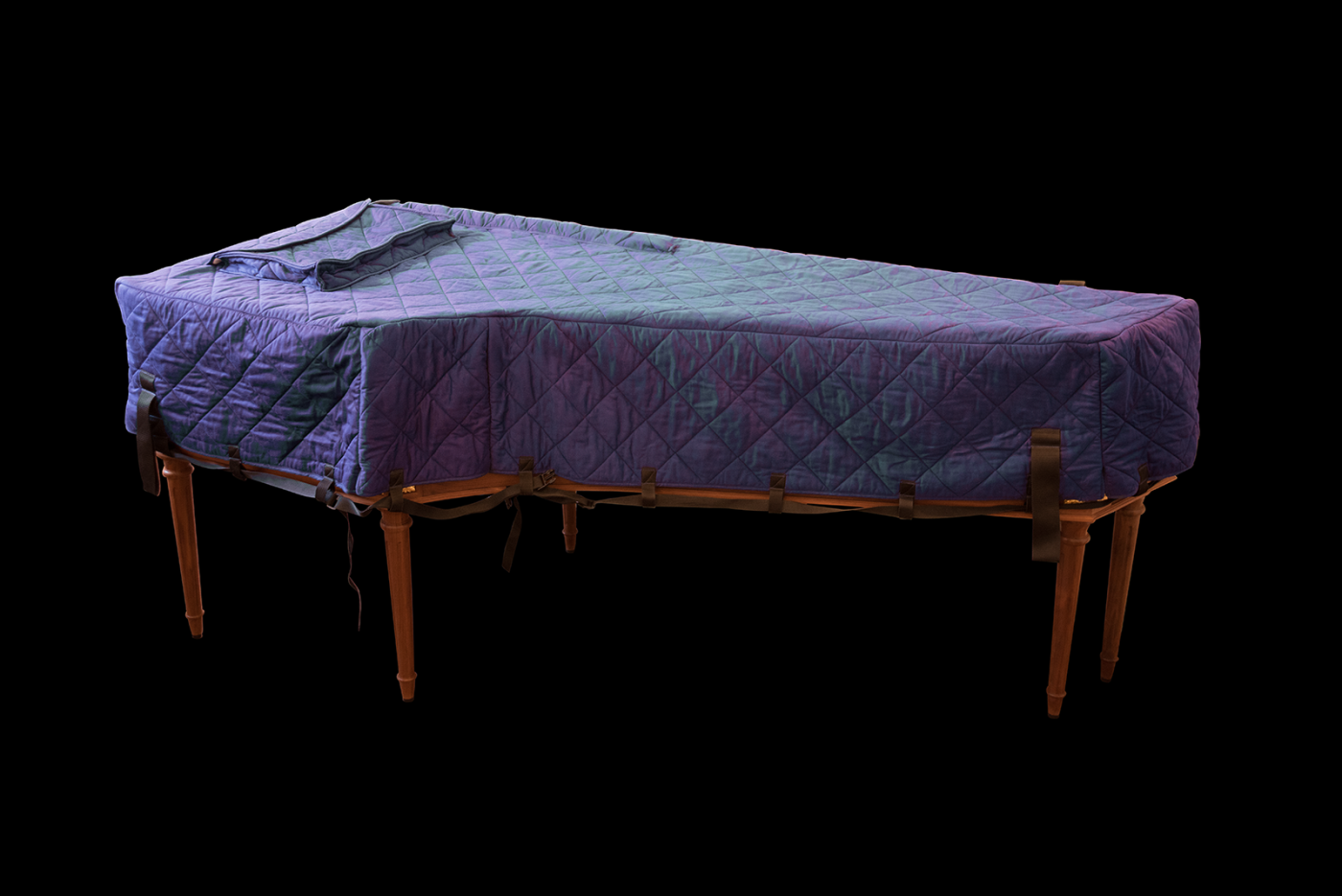 Die Transportdecken stellen wir aus einem Spezialstoff her, der extra für uns produziert wird - Farbabweichungen sind daher möglich. Das versteppte Material besteht aus einem blauen, reißfesten Baumwollstoff, einer ca. 1 cm dicken Filzeinlage und einem weißen Molton-Unterstoff. Eine komplette Decke für ein großes Cembalo wiegt ca. 4 kg.